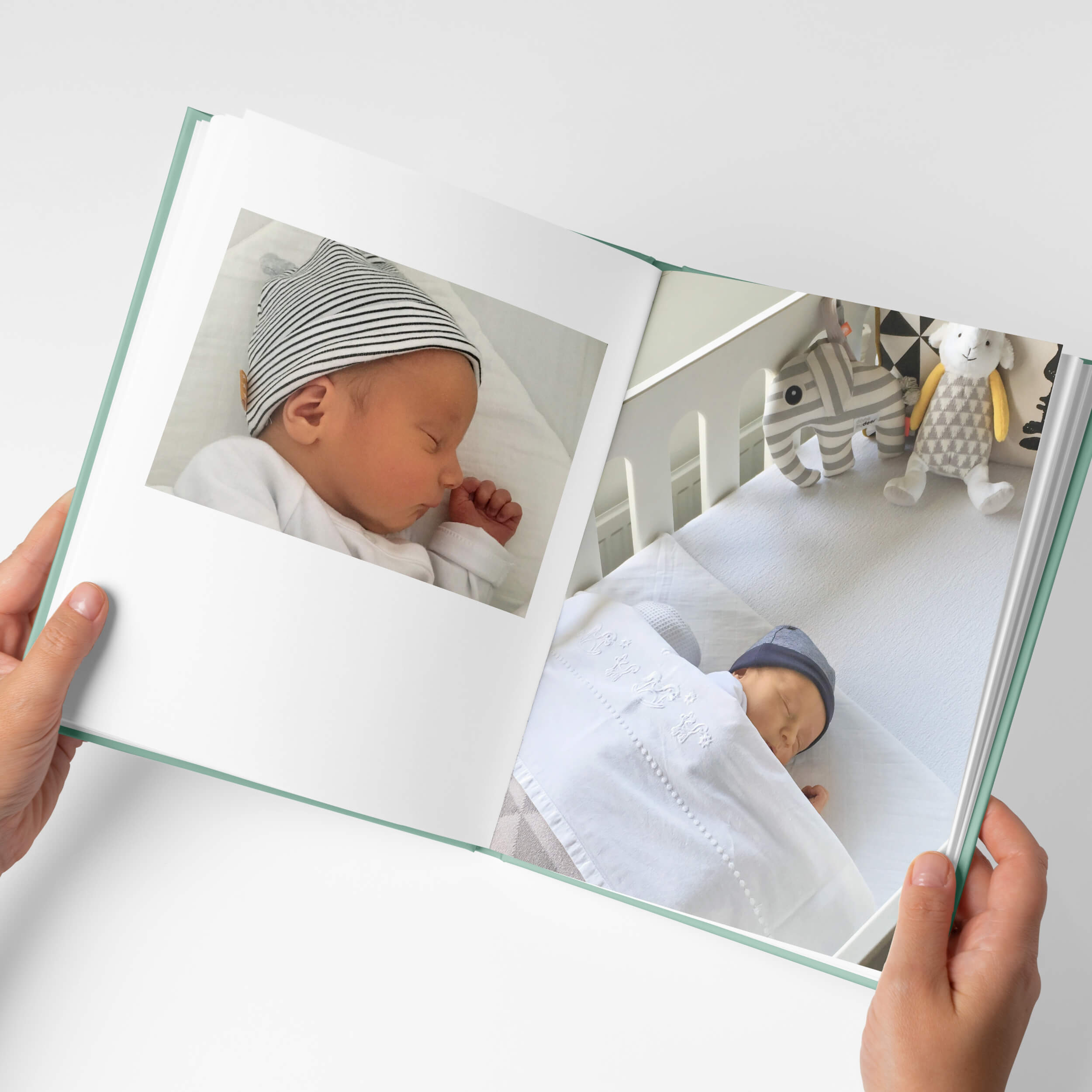 Er is plaats voor de hoogtepunten van je zwangerschap, de geboorte en het kraambezoek. Je laat ook de eerste keertjes zien, zoals in bad gaan of thuis slapen in een eigen bedje. Daarnaast is er ruimte om je mooiste foto’s van je zwangerschapsshoot en newbornshoot te laten stralen in het boek.