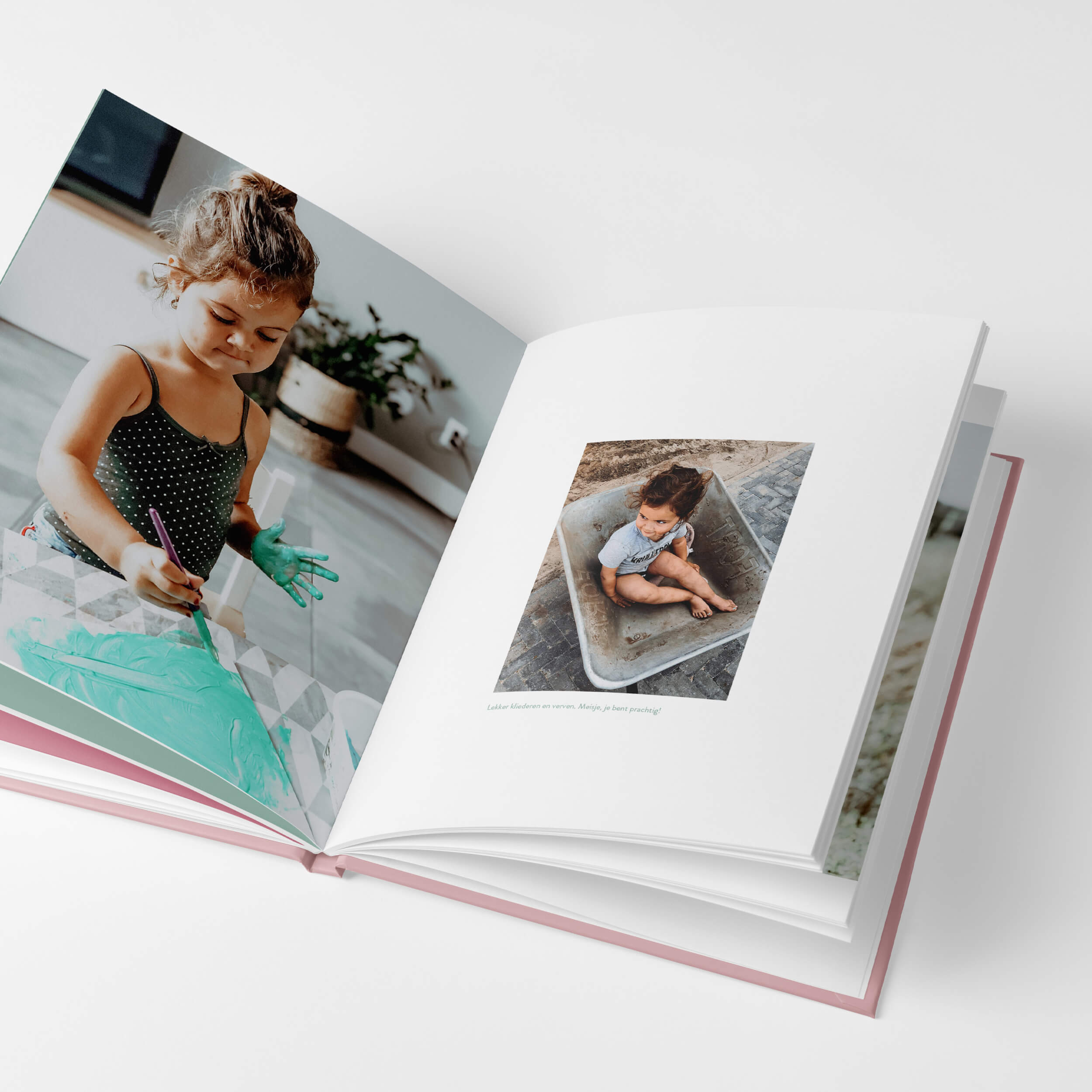 Ik wilde graag dat de boeken leuk zijn om vaak te bekijken, voor jou én voor je kindje. De kleuren vormen de basis in dit design, ik heb ze in balans gebracht met het verhaal. Als je goed kijkt zul je zien dat ze precies aansluiten bij de fases die je kindje op de foto's doormaakt.